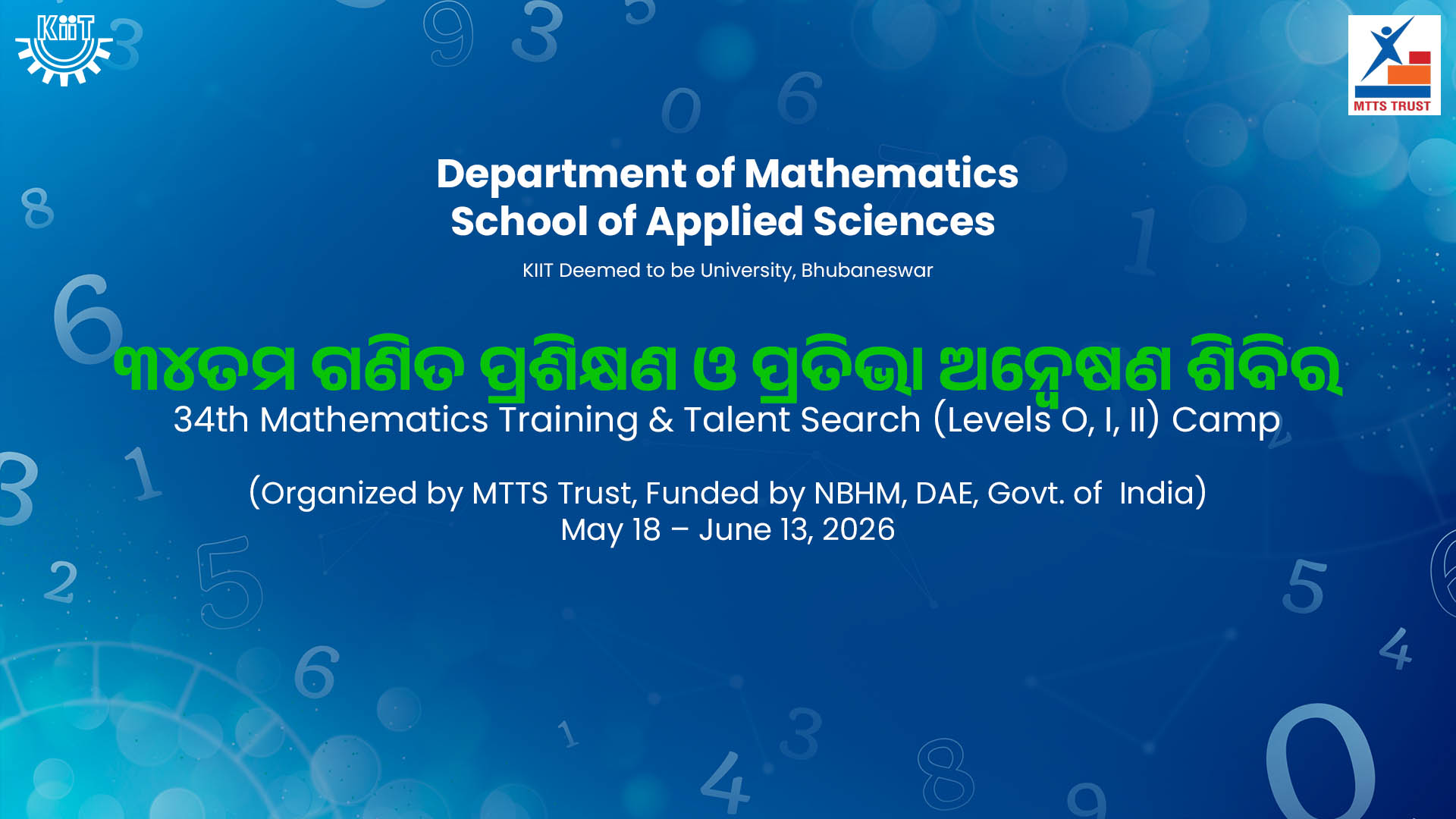 The Mathematics Training and Talent Search (MTTS) programme is one of the most popular and significant summer training programme which is usually conducted at regional level across the country. From May 18 to June 13, 2026, the main camp of MTTS will be organized at our university. During this 28-day programme, 130 (one hundred thirty)undergraduate and postgraduate students will be trained by 12 (twelve) resource persons and 8 (eight) mentors from reputed HEIs across India associated with KIIT Deemed to be University, Bhubaneswar. Dr. Abhijit Sutradhar and Dr. Manas Ranjan Mohapatra will coordinate this event supported by Prof. Mrutyunjay Das, Associate Dean of Dept. of Mathematics and Prof. Prasanta Rath, Dean of School of Applied Sciences patronized by Honorable Founder Sir Prof. (Dr.) Achyuta Samanta, esteemed Vice Chancellor Prof. Sharanjit Singh, and respected Registrar Prof. Jnyana Ranjan Mohanty. This event will attract students for undergraduate and postgraduate programme at the Department of Mathematics and contribute significantly towards the growth of the university as well at National level.